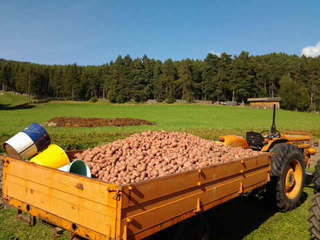 Im Frühjahr setzt man die Saatkartoffeln in den Acker, wobei man auf den abnehmenden Mond achten sollte. Bei idealer Witterung dauert es ungefähr drei bis vier Wochen bis die Kartoffelpflanzen aufgehen. Sobald die Kartoffelpflanzen gut sichtbar sind werden sie gehäufelt. Meist wird das maschinell gemacht, aber es gibt auch noch Bauern, die diese Arbeit mit dem "Pickel", der Hacke verrichten. Nach einigen Wochen beginnen schon die ersten Kartoffelpflanzen mit der Blüte. Man kann schon am Kartoffelkraut erkennen, wie es um die Kartoffeln steht. Sobald das Kartoffelkraut braun wird und abstirbt ist die Ernte nicht mehr weit. Eine Kartoffel ist reif wenn sich die Schale nicht mehr mit den Finger ablösen lässt. Gerichte wie Erdäpfelplattlen mit Kraut oder Herrngröstel, sowie Salzkartoffel oder Röster dürfen als Beilage auf Südtirols Speisekarten nicht fehlen .Die Kartoffel ist in der Küche sehr vielseitig und beliebt. Bei einer zünftigen Südtiroler Marende (Brotzeit) darf die Bellkartoffel natürlich auch nicht fehlen.