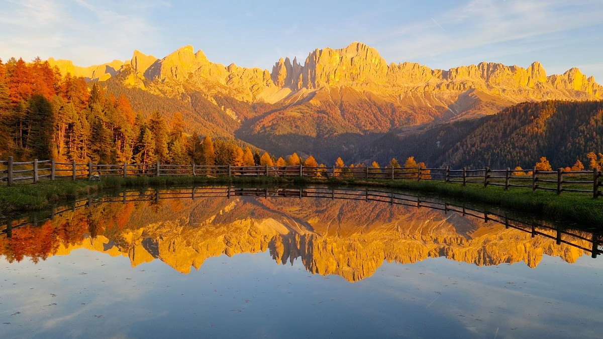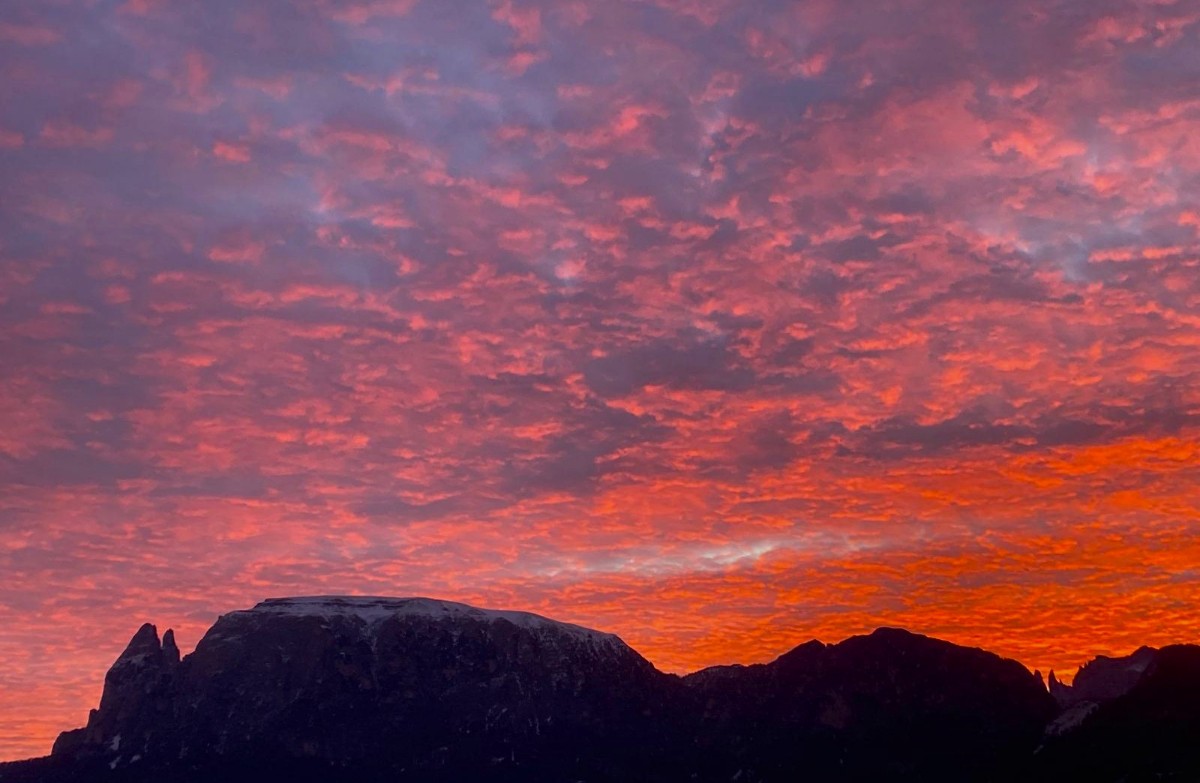 Die Dolomitenbewohner haben für dieses Phänomen eine eigene Geschichte erzählt, die Sage von König Laurin und seinem Rosengarten und da erzählt man sich: „Vor langer Zeit lebte im Felsmassiv des Rosengartens ein Zwergenvolk. König Laurin verliebte sich in die Tochter des Königs und plante, sie zu rauben. Doch die Männer des Königs zogen aus, um sie zurückzuholen. Um sich dem Kampf zu stellen, zog Laurin eine Tarnkappe über. Doch als er heimlich durch seinen Rosengarten schlich, verrieten die Blumen seine Position, und er wurde gefangen genommen. In seiner Wut verfluchte Laurin den Rosengarten, sodass er weder bei Tag noch bei Nacht blühen sollte –jedoch die Dämmerung vergaß er. So leuchtet der Rosengarten bis heute nur in den magischen Momenten des Sonnenuntergangs wenige Minuten und verzaubert alle, die das Glück haben, dieses Naturschauspiel zu erleben. Die Dolomiten, nicht umsonst ein „Weltnaturerbe“, sind bekannt für ihr außergewöhnlich farbintensives Leuchten – so intensiv, dass man auch von den Burning Dolomites („brennende Dolomiten“) spricht.