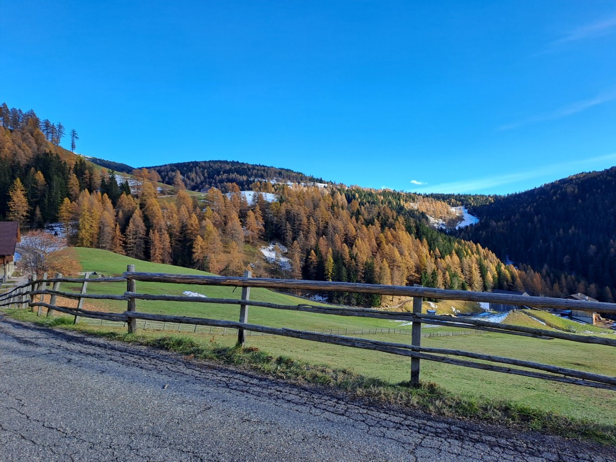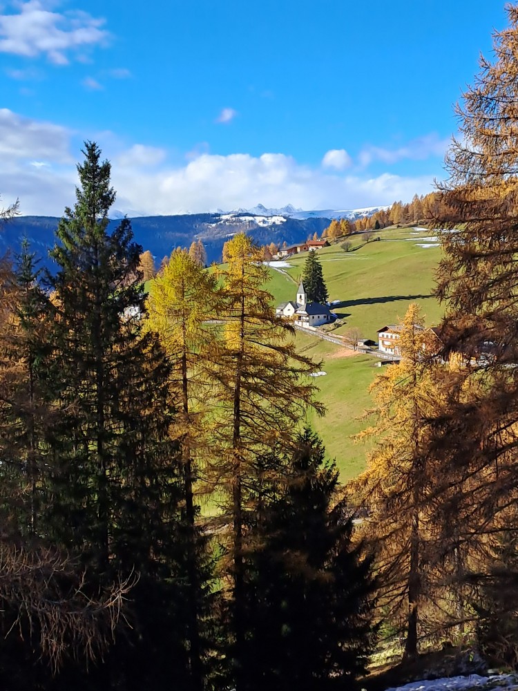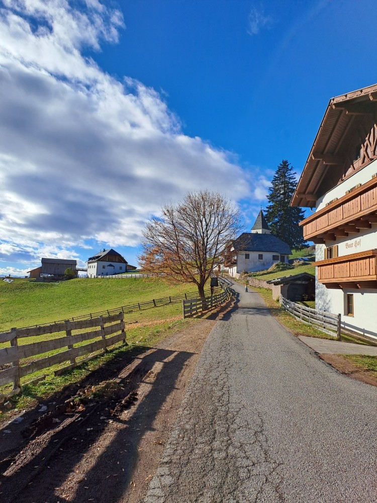 Eine beliebte Route startet in Pemmern, führt über den Rosswagen und vorbei an der kleinen Kirche zur Heimsuchung Marias. Dort kann man auf einer Bank in der Sonne sitzen und die Ruhe genießen. Die Umgebung, geprägt von traditionellen Bauernhöfen, ist ideal für eine Wanderung mit der Familie und gewährt weite Ausblicke auf die umliegenden Berge und Täler.. Besonders schön ist der Anblick der jungen Lärchen am Wegrand, die mit Baumbart und Flechten bewachsen sind.