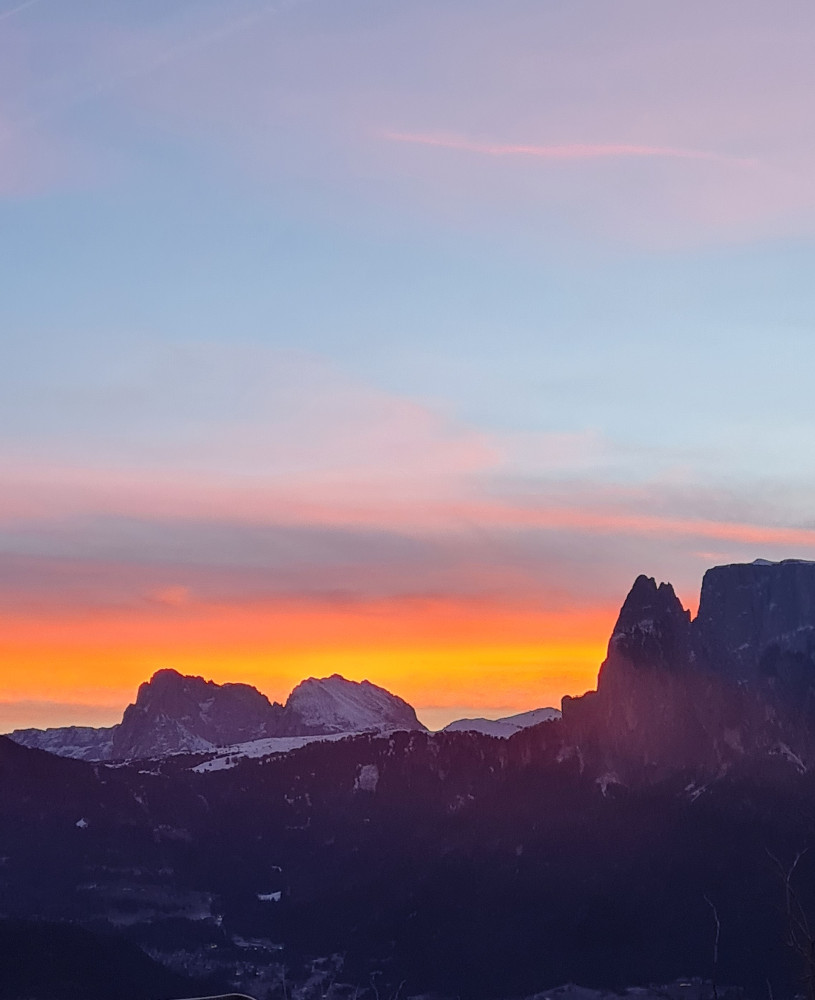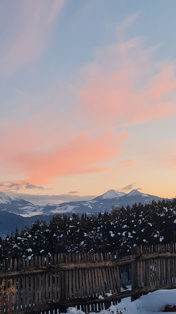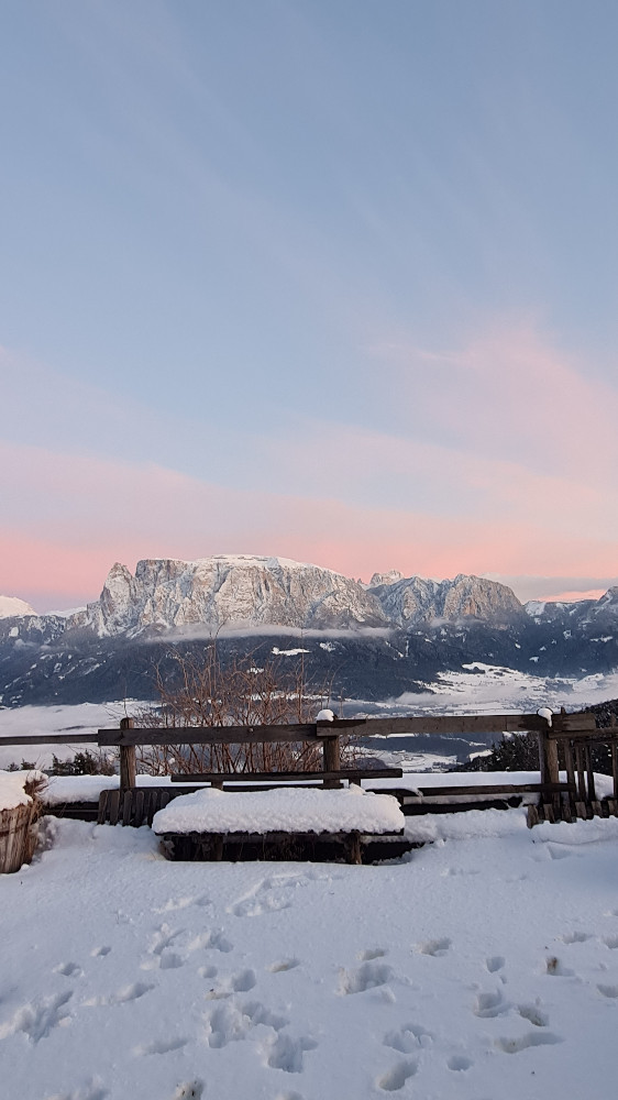 Wenn der Tag sich dem Ende neigt, hält der Winter am Ritten oft eine Überraschung bereit: Bei klarem Wetter erleben Sie magische Momente, in denen der Himmel und die Dolomitengipfel in feinen Pastelltönen oder einem tiefen Rot erglühen. Kein Filter der Welt kann dieses Alpenglühen nachahmen.