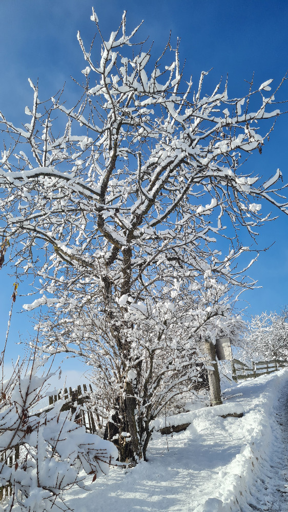 Wenn Frau Holle es ordentlich schneien lässt, hüllt sich unser Hof in eine dicke weiße Decke und die Welt scheint für einen Moment stillzustehen. Unsere Bäume tragen schwere Schneekronen, während die Wiesen friedlich unter dem Weiß ruhen.
