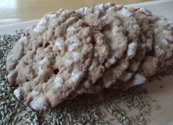 The South Tyrolean Schüttelbrot is a thin, hard and crispy flatbread. According to an old tradition, the Schüttelbrot is made from rye flour, water, yeast, salt and various spices (fennel, aniseed, bread clover). The raw dough pieces are shaken by hand on round wooden boards. Then they are baked crispy at a low temperature.