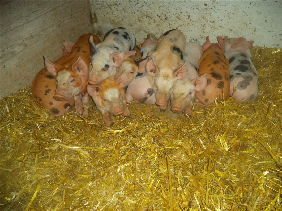 The mother sows give birth to three to eighteen piglets twice a year after a gestation period of 3 months, 3 weeks and 3 days, naturally nursed for about 15 weeks. During feeding, the sow grunts a bit with the piglets. They communicate constantly with each other.